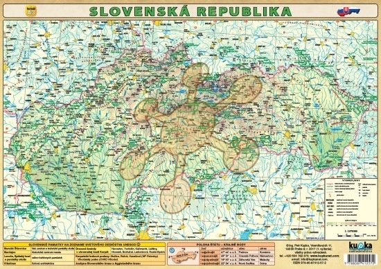 Všeobecnozemepisná mapa Slovenskej republiky so súborom doplnkových mapiek, tabuliek a grafov – administratívna mapa, zemepisné rekordy Slovenska, obyvateľstvo, poľnohospodárstvo a hospodárstvo v aktuálnych číslach.