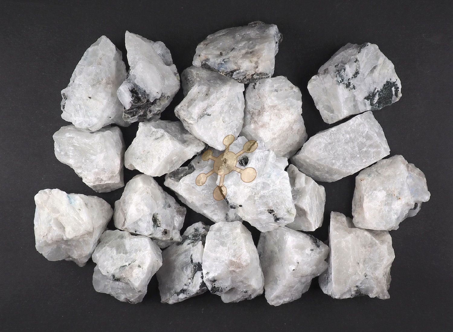 Surové kúsky mesačného kameňa.Mesačný kameň je úzko spätý s Mesiacom a intuíciou. Priťahuje lásku a rieši milenecké problémy. Zaisťuje pokojný spánok. Mierne ochranný obzvlášť na cestách. Obnovuje a uchováva mladistvý vzhľad a prístup. Vyťahuje na povrch veci uzavreté v podvedomí, upokojuje rozbúrené city a prehnané emotívne reakcie. Na čakre solar plexu ukáže staré nefunkčné citové spôsoby jednania a pomáha ich odstrániť.Liečebné využitie: lieči horný zažívací trakt a odstraňuje z neho citové napätie, pôsobí na tráviace a reprodukčné orgány, znižuje napätie pri menštruácii, udržuje v rovnováhe hormonálny systém, upokojuje hyperaktívne deti, detoxikuje, lieči problémy kože, vlasov, očí, pankreasu a pečene . Pomáha pri počatí, tehotenstve, pôrode a dojčení.