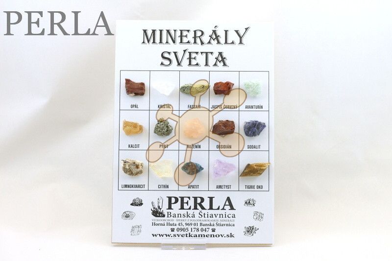 Vzorkovník 15 druhov polodrahokamov, veľkosti cca 2cm s nalepenými surovými kameňmi. Vzorkovnik obsahuje opál, krištáľ, fassait, jaspis červený, avanturín, kalcit, pyrit, ruženín, obsidián, sodalit, limnokvarcit, citrín, apatit, ametyst, siderit. Polodrahokamy sú zoradené a nalepené na drevenej karte rozmerov 18x12cm. Obrázok ilustačný.