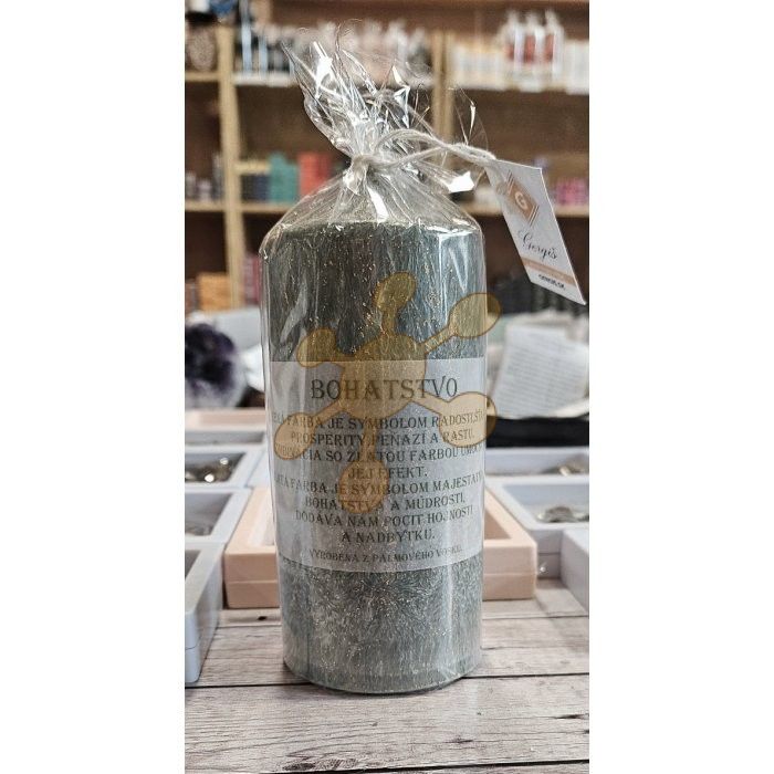 Originálna očistná a intuitívna sviečka Bohatstvo z ateliéru Gergiš. Priemer : 6 cm, výška 11,5 cm.Zelená smaragdová farba je symbolom bohatstva, radosti, prosperity, peňazí, šťastia a rastu. Kombinácia so zlatou farbou umocňuje jej efekt. Zlatá farba dodáva majestátnosť a pocit hojnosti a nadbytku. Každá sviečka je originál. Z palmového vosku. Hmotnosť : cca 290g.