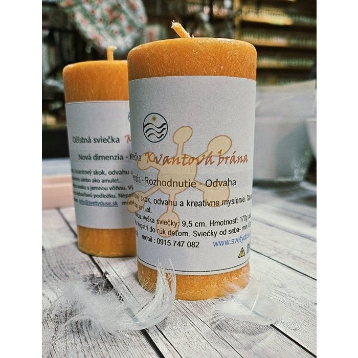 Intuitívna a očistná sviečka oranžovej farby Kvantová brána pre radikálnu zmenu v živote, kvantový skok, novú energiu, odvahu a kreatívne myslenie. Vyrobená ručne z kvalitného palmového vosku s jemnou vôňou. Výška sviečky: 9,5 cm. Priemer: 5 cm. Hmotnosť: cca 170 - 180g. Čas horenia cca 25 hod. Nechať horieť denne 2 - 4 hodiny a opatrne uhasiť.Vyrobené na Slovensku.