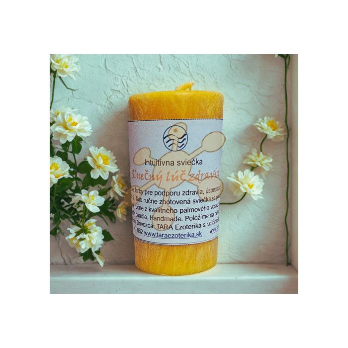 Intuitívna a ochranná sviečka teplej zlatožltej farby Slnečný lúč zdravia pre posilnenie zdravia a uzdravenie. Túto ručne zhotovenú sviečku s jemným plameňom je možné použiť pri modlitbe, vizualizácií alebo ako amulet pri cestách. Vyrobená ručne z kvalitného palmového vosku s jemnou vôňou. Výška sviečky: 9,5 cm. Hmotnosť: 170g cca. Položíme na nehorľavú podložku. Nepatrí do rúk deťom. Sviečky od seba- min.10 cm.