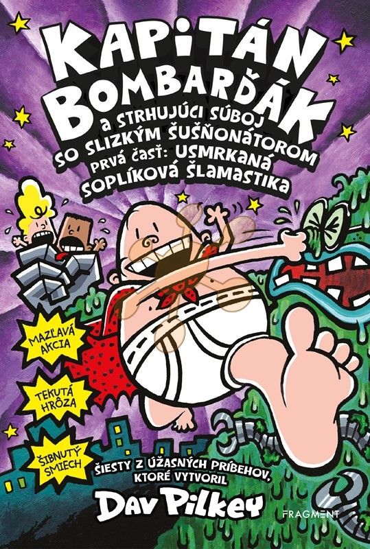 George a Harold sa dostali do poriadne mazľavej… kaše. Ich posledný žartík triedneho bifľoša Melvina Sneedlyho tak rozhnevá, že prisahá pomstu. Pokúsi sa premeniť na bionického superchlapca, no veci sa trošku skomplikujú – a Slizký Šušňonátor je na svete! Dokáže KAPITÁN BOMBARĎÁK túto mľaskavú, lesklú a hlienmi pokrytú príšeru zastaviť? Bežte si po vreckovky a poďme to spolu zistiť!