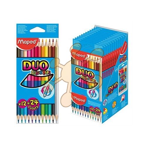 12 ks obojstranných ceruziek, spolu 24 farieb. Súprava obsahuje aj zlatú a striebornú ceruzku. Trojhranné telo, mäkká a odolná tuha. Šírka tuhy 2,9 mm. Francúzka značka MAPED zaručuje vysokú kvalitu, funkčnosť a moderný dizajn.