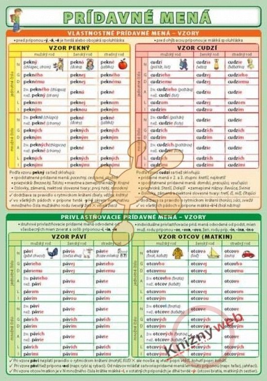 Prehľadne spracovaný a bohato ilustrovaný prehľad prídavných mien vhodný i pre dyslektikov.Vzory vlastnostných a privlastňovacích prídavných mien, pravopis koncoviek, delenie prídavných mien, stupňovanie prídavných mien