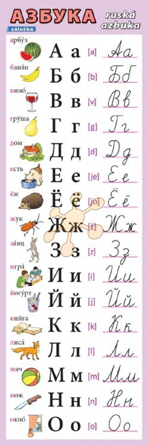 Praktická záložka obsahuje tlačené a písané písmená ruskej abecedy vrátane výslovnosti a názorného obrázka.